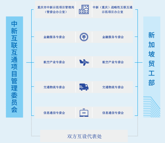 重庆市成立中新(重庆)战略性互联互通示范项目管理委员会,由市政府常务副市长任主任,市政府分管副市长任常务副主任。成立重庆市中新示范项目管理局(重庆市政府直属机构),负责统一管理中新互联互通项目,履行中新互联互通项目管委会办公室职责。新加坡贸工部成立中新互联互通项目办公室,负责协调新方相关部委。