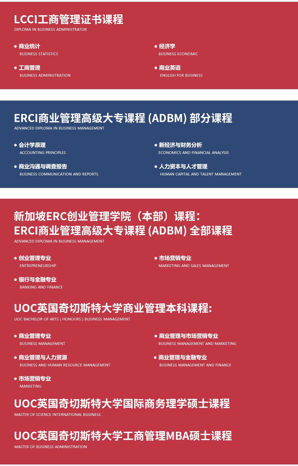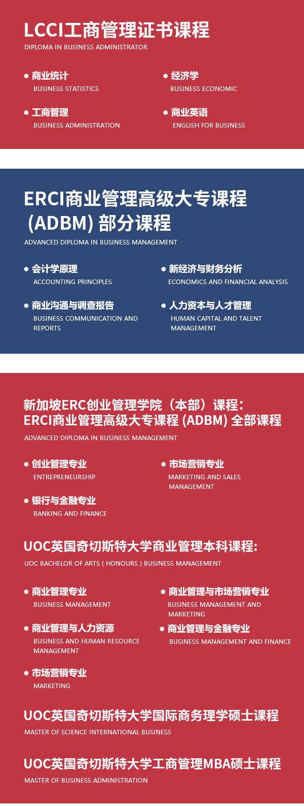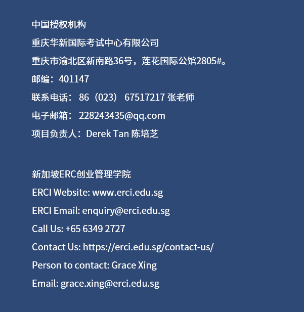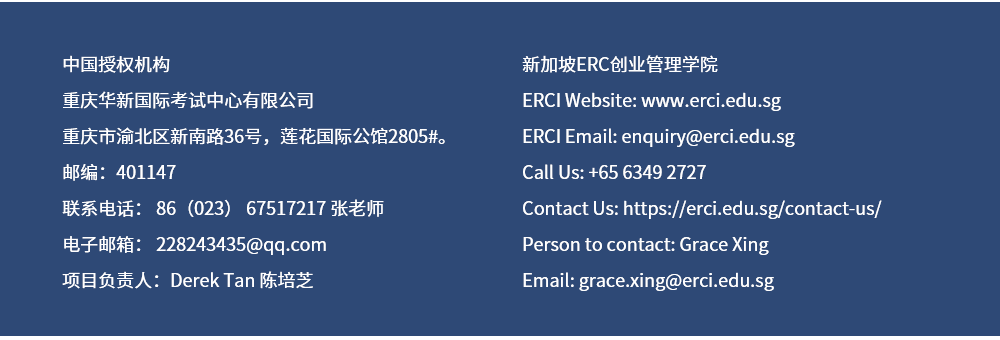 新加坡ERC创业管理学院授权重庆华新国际考试中心执行中国境内ADBM的招生,培训与考试工作;新加坡ERC创业管理学院同时接受并认可重庆华新国际考试中心的学员在完成LCCI工商管理证书课程,通过考试后,就可以报读ERCI的ADBM课程。
