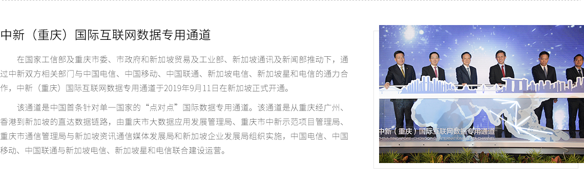 在国家工信部及重庆市委、市政府和新加坡贸易及工业部、新加坡通讯及新闻部推动下,通过中新双方相关部门与中国电信、中国移动、中国联通、新加坡电信、新加坡星和电信的通力合作,中新(重庆)国际互联网数据专用通道于2019年9月11日在新加坡正式开通。该通道是中国首条针对单一国家的“点对点”国际数据专用通道……
