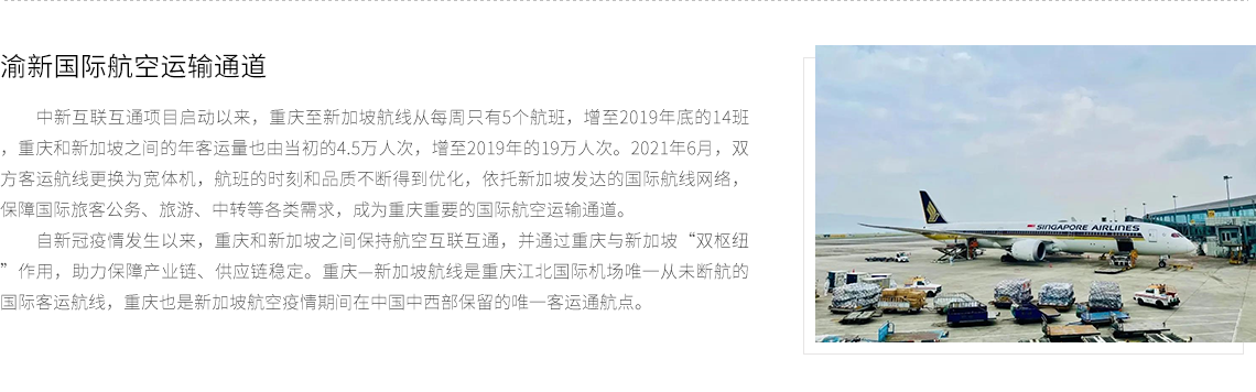 自新冠疫情发生以来,重庆和新加坡之间保持航空互联互通,并通过重庆与新加坡“双枢纽”作用,助力保障产业链、供应链稳定。重庆—新加坡航线是重庆江北国际机场唯一从未断航的国际客运航线,重庆也是新加坡航空疫情期间在中国中西部保留的唯一客运通航点。