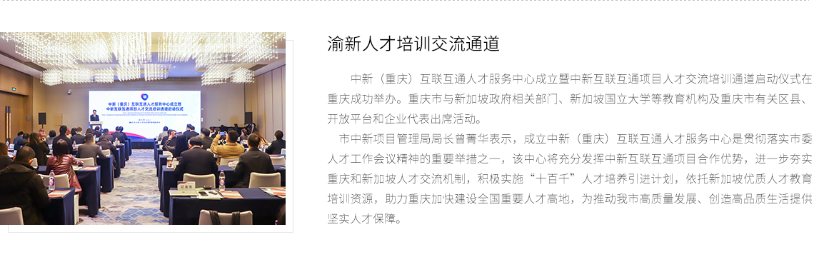 中新(重庆)互联互通人才服务中心成立暨中新互联互通项目人才交流培训通道启动仪式在重庆成功举办。重庆市与新加坡政府相关部门、新加坡国立大学等教育机构及重庆市有关区县、开放平台和企业代表出席活动。见证下,中新两国政府签署关于“陆海新通道”建设合作备忘录……