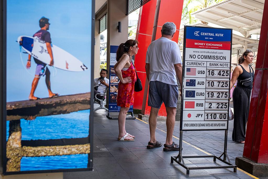 巴厘岛购物区的一个外币兑换广告牌。(视觉中国)