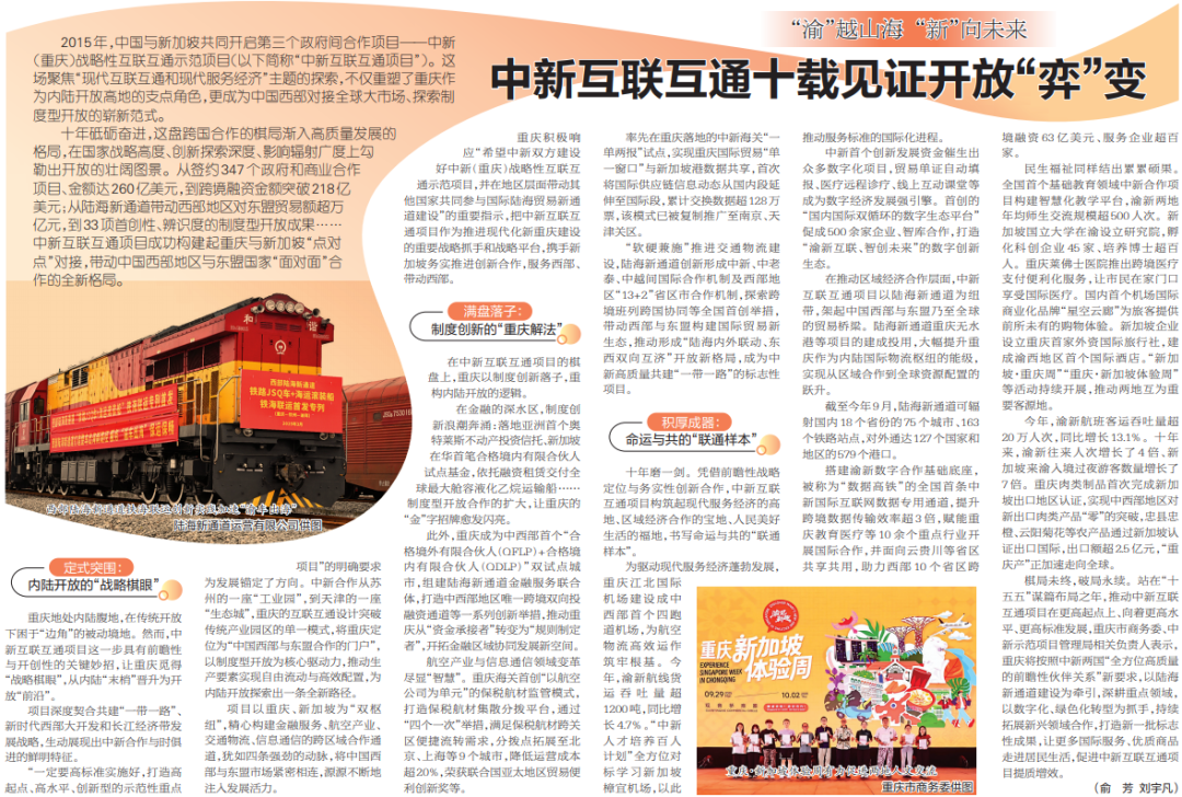 十年砥砺奋进,这盘跨国合作的棋局渐入高质量发展的格局,在国家战略高度、创新探索深度、影响辐射广度上勾勒出开放的壮阔图景。从签约347个政府和商业合作项目、金额达260亿美元,到跨境融资金额突破217亿美元;从陆海新通道带动西部地区对东盟贸易额超万亿元,到33项首创性、辨识度的制度型开放成果……中新互联互通项目成功构建起重庆与新加坡“点对点”对接,带动中国西部地区与东盟国家“面对面”合作的全新格局。