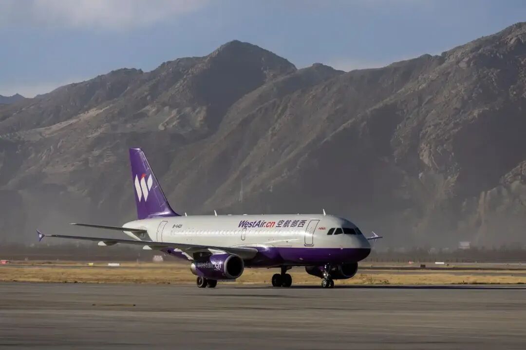 ▲2024年12月25日,执飞拉萨—重庆—新加坡国际新航线首飞任务的西部航空PN6425客运航班在拉萨贡嘎国际机场滑行。记者 蒋梦辰 摄/新华社