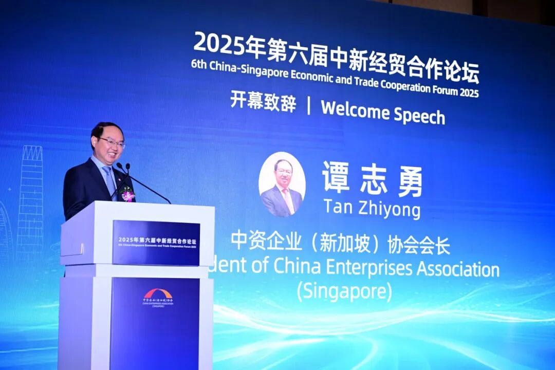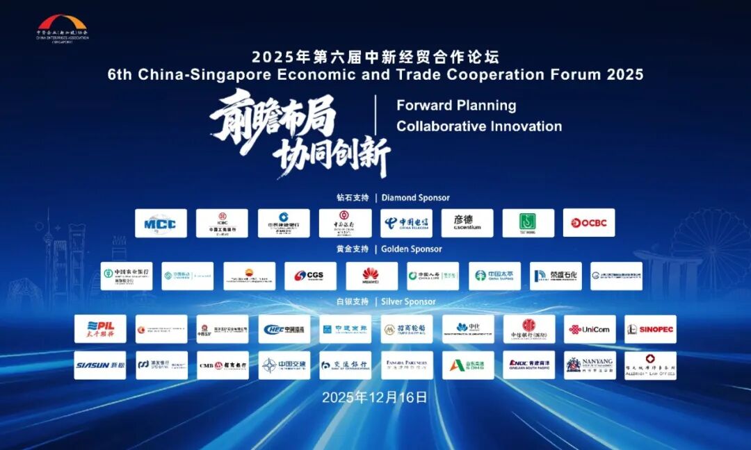 2025年12月16日,第六届中新经贸合作主题论坛在香格里拉酒店成功举办。本届论坛主题为“前瞻布局 协同创新”。中国驻新加坡大使曹忠明,中资企业(新加坡)协会会长谭志勇、新加坡中华总商会会长高泉庆,中国驻新使馆大使馆康伊明参赞、新加坡贸工部、企业发展局等中新两国政府机构、商协会、专家学者、新闻媒体、友好人士及企业代表600人出席论坛。