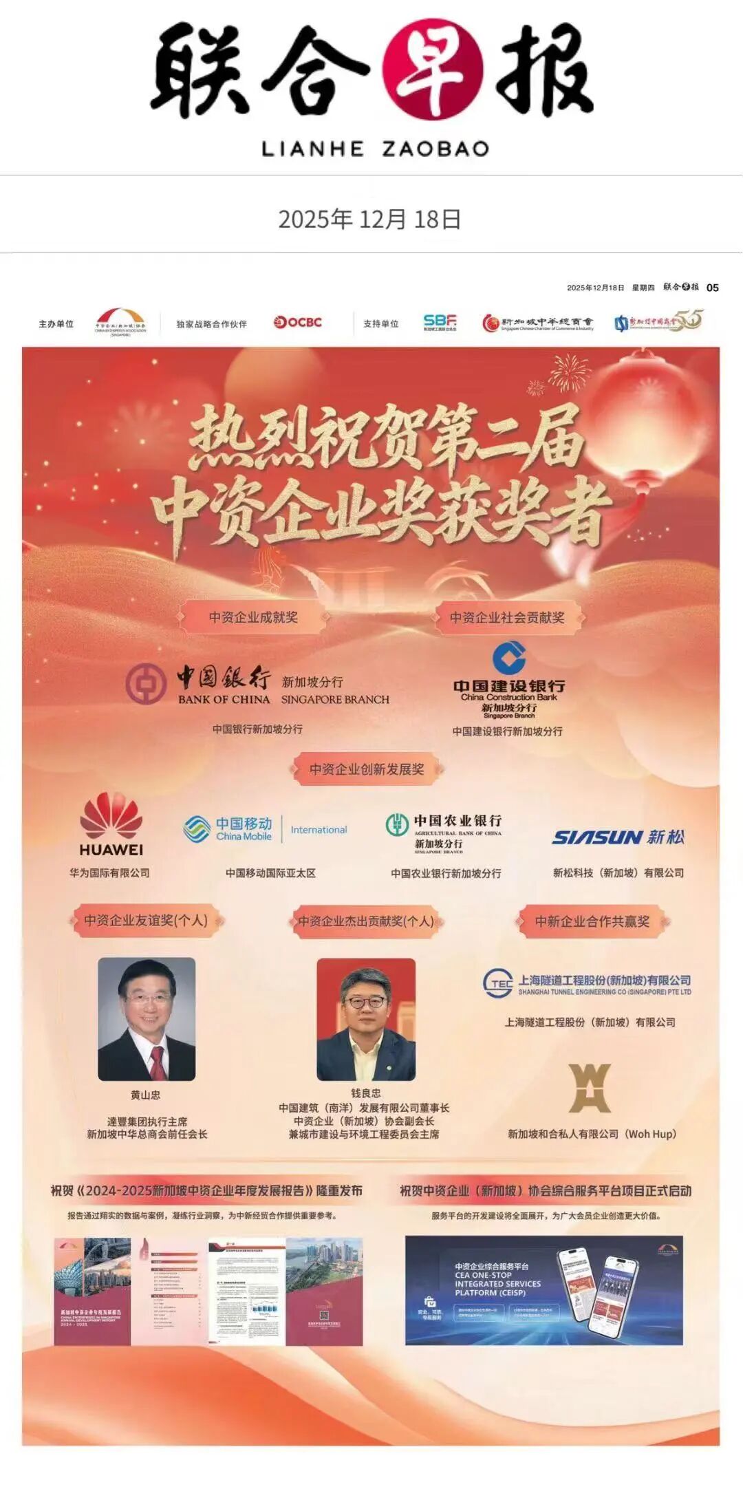 本次论坛隆重举行了新加坡中资企业年度发展报(2024-2025)发布会、“中资企业综合服务平台”启动仪式及第二届“中资企业奖”颁奖仪式。