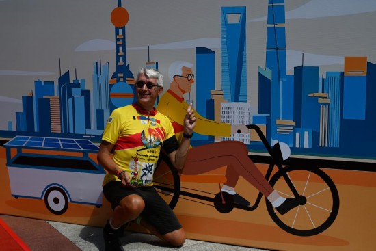 8月30日,在上海东方明珠广播电视塔城市广场,骑行爱好者克劳德·布鲁尔与自己的漫画形象背景墙合影。新华社记者 陈爱平 摄