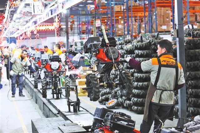 (位于巴南区的一家农机公司,工人在装配耕作机。通讯员 李攀 摄/视觉重庆)