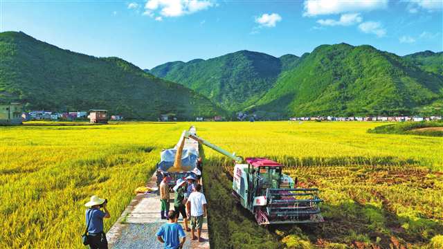 (巫山县庙宇镇永安村,农机手驾驶收割机在收割水稻。特约摄影 王忠虎/视觉重庆)