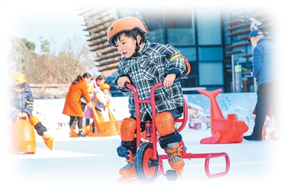 1月7日,游客在浙江省湖州市德清县下渚湖·奇幻谷景区户外冰场体验冰上自行车。