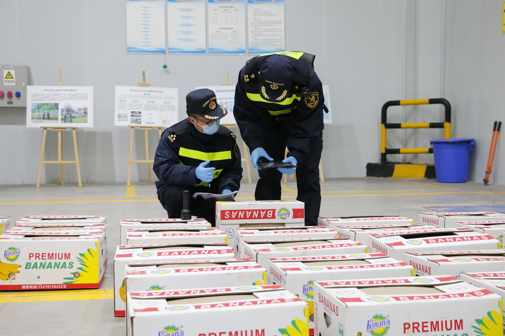 为提升进口水果品质,提高通关便利性,重庆海关率先开展西部陆海新通道指运地检验检疫进口水果试点,主动加强与昆明海关、重庆市政府口岸物流办协作配合,建立高效联动机制,组建专项服务小组,从政策宣贯、境外企业确认、检疫许可证申请等方面,全程“一对一”指导。应用电子集装箱锁,实时掌握物流动态,严密在途监管,实行“即到、即查、即放”,提高通关效率,降低物流成本,保障产业链供应链的稳定与高效。货物抵达重庆果园港进境水果指定监管场地后,重点排查是否携带实蝇、介壳虫等我国重点关注的检疫性有害生物,切实保障国门生物安全。