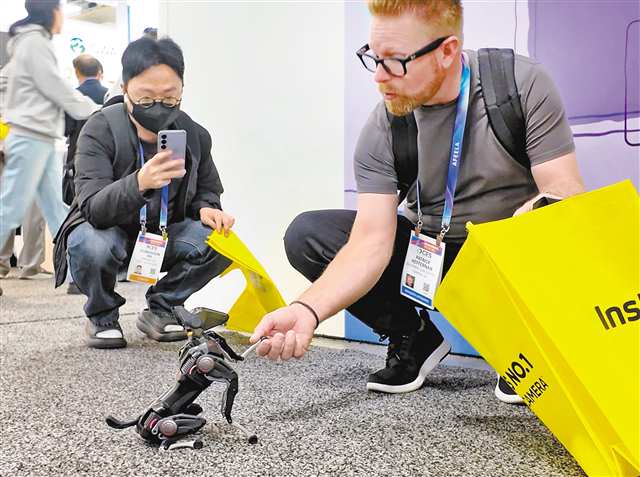 在二○二六年国际电子消费展上,观展者在和重庆造哮天Sirius智能机器狗互动。(受访者供图)