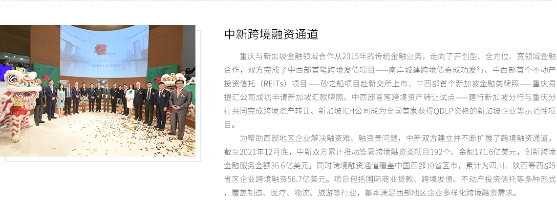 重庆与新加坡金融领域合作从2015年的传统金融业务,走向了开创型、全方位、宽领域金融合作,双方完成了中西部首笔跨境发债项目——南岸城建跨境债券成功发行、中西部首个不动产投资信托(REITs)项目——砂之船项目赴新交所上市、中西部首个新加坡金融类牌照——重庆易捷汇公司成功申请新加坡汇款牌照……